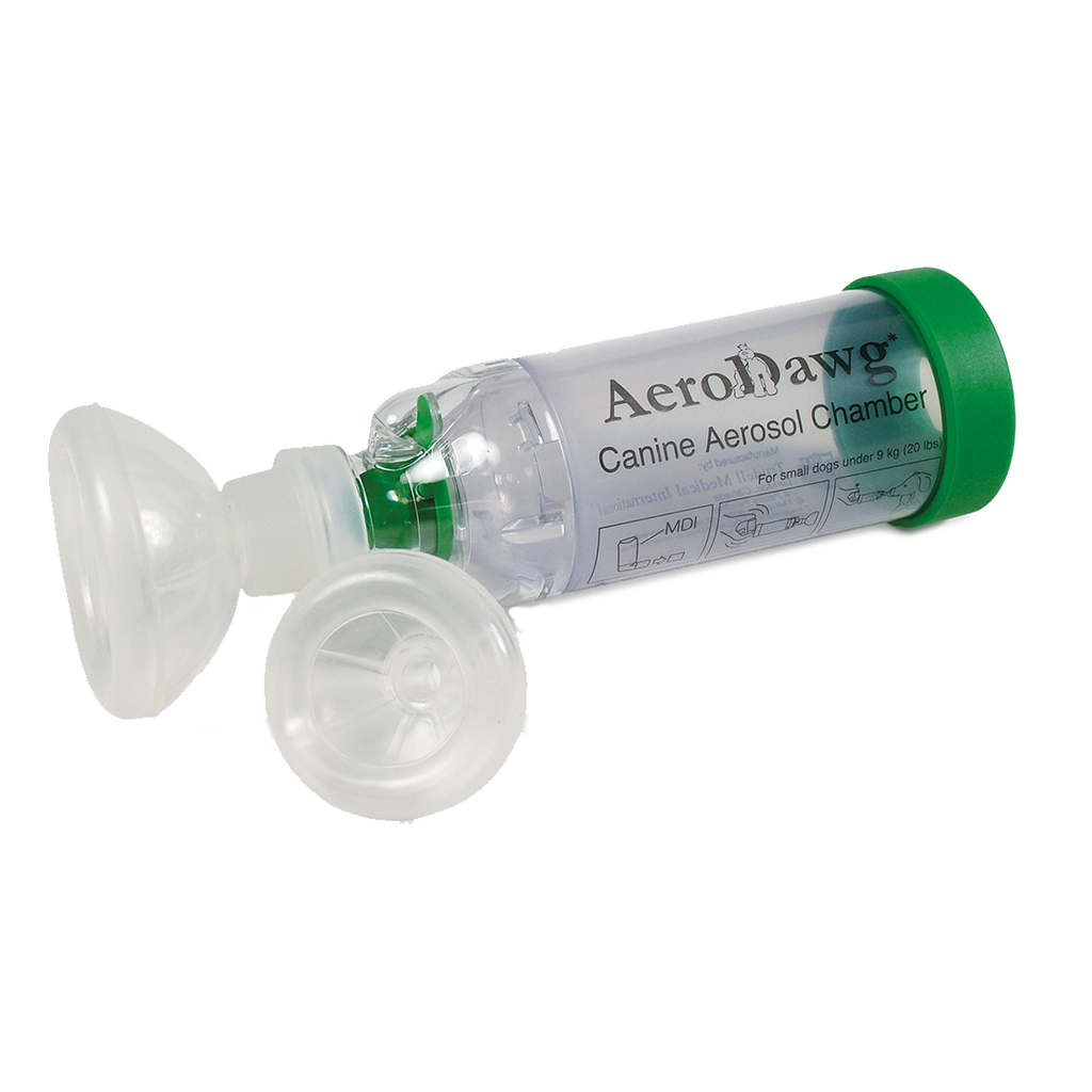 The AeroDawg* Canine Aerosol Chamber was developed by Trudell Medical International to be used along with a puffer to deliver aerosol medication to your dog.